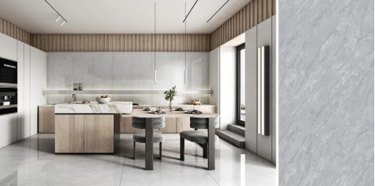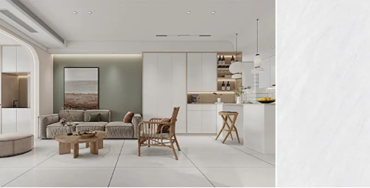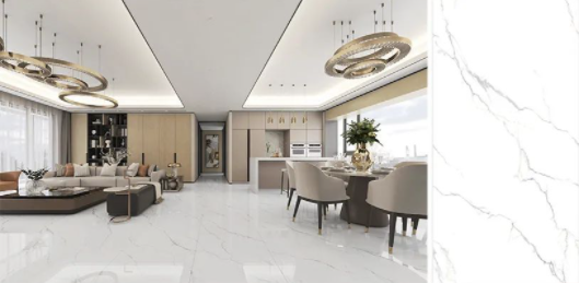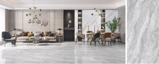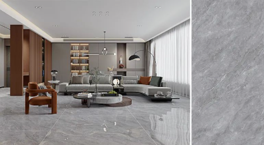 樓蘭灰,通透的理石紋磚麵泛起粼粼波光,如同陽光照耀下的冰川般幹淨純粹,在不動神色間展現出高貴精致的磅礴氣勢。