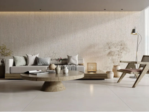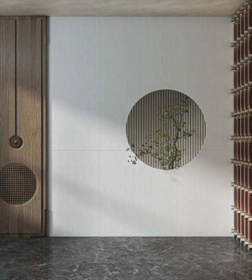 牆麵選用750X1500mm規格的宋素|凡古磚綺羅香,整體基調偏向淺色係,搭配原木色等主體色,仿佛呼吸著大自然的氣息,領悟塵世喧囂中的靜謐。