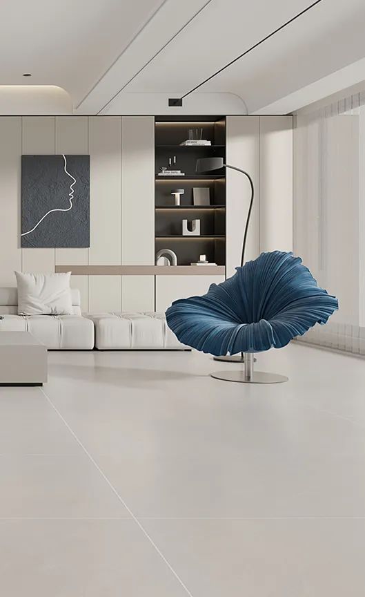 鵲踏枝色調素雅溫馨,750X1500mm黃金比例通鋪地麵,搭配米灰色家具仿佛被陽光包圍,低調中散發著淡淡光芒,讓人不知不覺間沉醉其中。